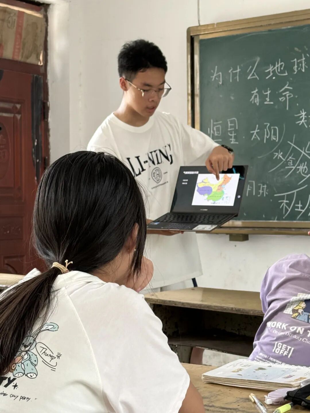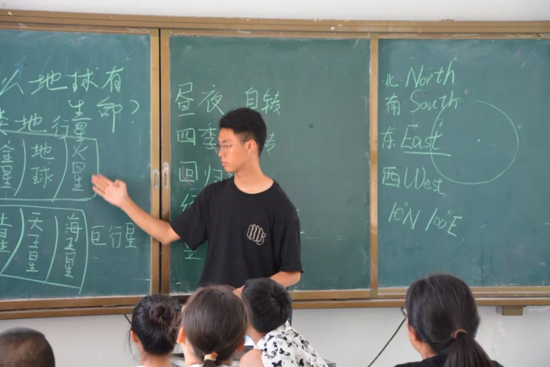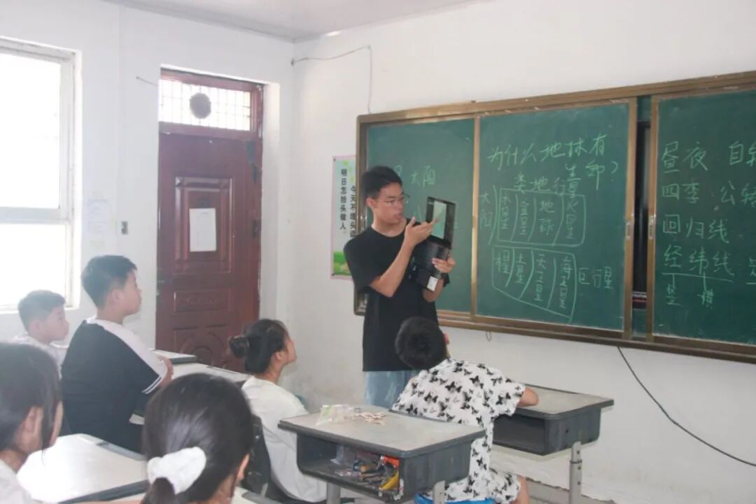 Q4.听老师介绍您目前还在读高中,课业繁忙的同时如何兼顾好支教的授课呢? A4.我是5月份左右看到这次支教的招募并进行报名的,然后就在思考自己要教什么科目。确定教天文课之后,就开始着手操作制作PPT,熟悉使用实景三维地图等等。比较累的时候,就把设计课程当作一种特殊的放松方式,我觉得这很好的平衡了我的学业和前期准备工作。 ![]() 支教的故事 Q5.您说到“似乎点亮了一盏新的灯”,可以给我们分享一下这当中的故事吗? A5.其实是我对公益理解的变化,来支教前我认为做公益做支教就是捐物资,去年源公益给汶河小学补墙补房顶,今年给每个教室都装上空调,而我们只需要去进行授课,让孩子们学习到一些新知识就足够了。但事实并非如此,我希望把我所知道的全部教给他们,但是他们无法全部吸收甚至很快遗忘,这让我开始思考“支教究竟教些什么”。我们设计的很多课程,像科学课和AI电脑课,甚至是我们讲到的天文地理课,其实是孩子们从来没有接触过的。设计这些课程的初衷绝对不只是让孩子们学习技能和方法,更是开启思维和心智,让孩子们知道原来世上还有这般奇妙的存在。我们这一次来就是帮助孩子们找到更多的“第一次”,也许是第一次看到更大的世界,也许是第一次挖掘自己的兴趣,甚至说是第一次规划自己的人生。他们接触到从来没有接触过的事情,若对它产生了兴趣,就能被称为“点燃了一盏灯”。可能孩子们之前对天文没有概念,但是因为这样一次启发,有的孩子可能之后就会朝这个方向发展成为一名天文学家。所以我觉得这就是帮助孩子们挖掘了更多兴趣,找到了一种新的可能,燃起对未来的憧憬。